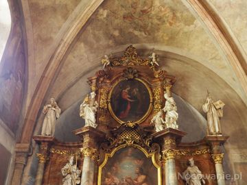 kaplica św. Jana Chrzciciela - obraz przedstawia chrzest Pana Jezusa w rzece Jordan, wyżej : obraz w owalu, tam Elżbieta spotyka brzemienną Maryję. (Trzebnica)