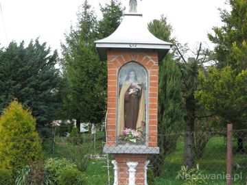 kapliczka przydomowa z figurą świętej w oszklonej niszy, słupowa, z balaskami, dwukondygnacyjna, zwieńczona metalowym krzyżem nad kopułą a w niej pozorna przeszklona latarnia z figurką.