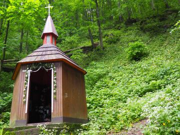 kapliczka z figurą św. Jana z Dukli, w niej też ujęte cembrowiną źródełko - to miejsce wskazuje na pustelnię i tu może świętego odwiedził św. Jan Kanty w drodze przez Węgry do Włoch ?