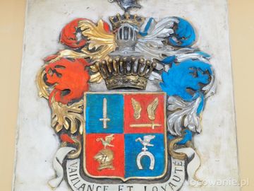 kartusz herbowy - prezentowany pośród eksponatów w oficynie dworskiej.