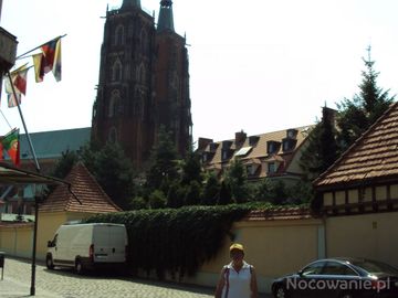 katedra pw. św. Jana Chrzciciela, tu po lewej flagi zawieszone na balkonie przed wejściem do Domu Pielgrzyma. (Wrocław)