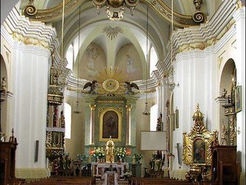 Klasycystyczny ołtarz główny z renesansowym tabernakulum (ok. 1600 r) w kształcie złoconej miniatury świątyni.