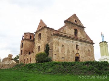 Klasztor Karmelitów Bosych - od strony owalnych tarasów i dziedzińca, niegdyś otoczonych balustradą ze schodami. Poniżej był też budynek bramny, piętrowy, ze strzelnicami, w narożniku murów obronnych była wieżyczka obserwacyjna.