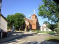 Kolno-zabudowania gospodarcze,w tle wieża kościła z końca XIXw.i początku XXw. (Kolno)