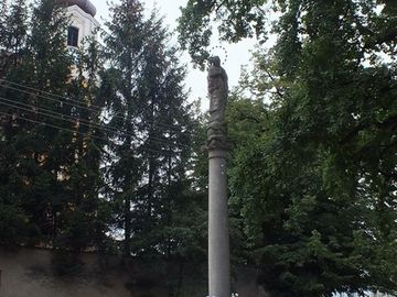 Kolumna Maryjna, w głębi wieża kościoła paraf. św. Wawrzyńca