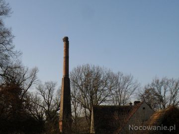 Komin ostatnia budowla po gorzelni "zagospodarowany" przez bociany