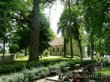 Kościół i parafialny cmentarz położony wśród pól Wieszyna (Wieszyno)