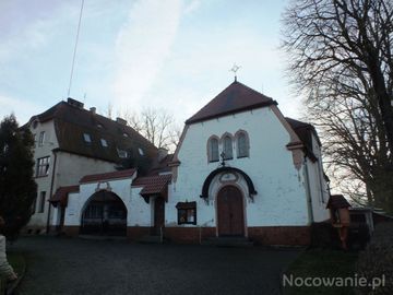 Kościół Najśw.Serca Pana Jezusa a "doklejony " po lewej stronie budynek to przedwojenny dom starców obecnie mieszkalny, wielorodzinny (Chwalimierz)