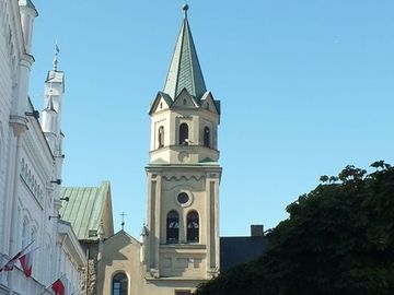 Kościół o.o. Franciszkanów p w Podwyższenia Krzyża Świętego, sanktuarium Matki Bożej Pocieszenia. W tym kościele został ochrzczony /w 1845 r/ św. ks. Zygmunt Gorazdowski, założyciel Zgromadzenia Sióstr Józefitek.