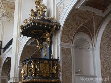 Kościół otrzymał układ halowo-emporowy: po obu stronach nawy głównej umieszczono rzędy kaplic - n/z ambona, pięknie ubogacona a jej baldachim wieńczy figura Bog (Krzeszów)