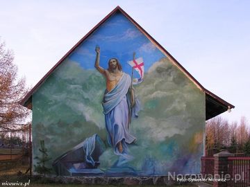Kozioł. Na uwagę zasługuje piękne malowidło Jezusa zmartwychwstałego na szczycie domu gospodarczego przy cmentarzu parafialnym Najświętszego Serca Jezusowego w Kożle Sylwester Nicewicz