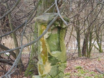 krzyż kamienny, z płyciną w postumencie, w przednim wizerunku podstawy - bukwy cyrylicy identyfikujące zmarłego, zdjęcie na przysiółku Olchowiec - po zejściu z (Wujskie)