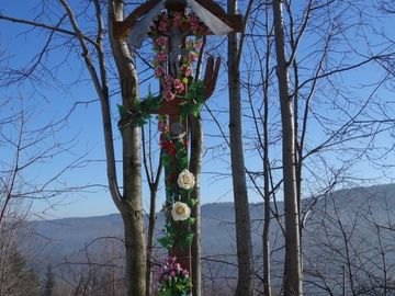 Krzyż na Jaworzu. Górskim osiedlu Harbutowic pod szczytem Kijowej Góry.(Czasem zwanej też Jaworzem) (Harbutowice)