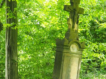 krzyż na kamiennym cokole - pomnik nagrobny o bogatej ornamentyce, na cmentarzu przycerkiewnym.