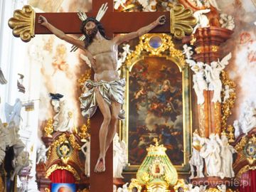 krzyż przed ołtarzem głównym, nad tabernakulum usytuowana Ikona Matki Bożej Łaskawej, ten cudami słynący obraz ukoronował w 1997r. Papież Jan Paweł II. (Krzeszów)