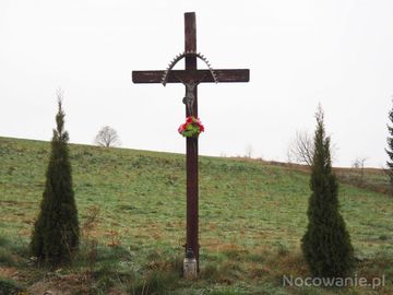 krzyż przydrożny z baldachimem nad Wizerunkiem Ukrzyżowanego.
