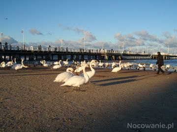 Łabędzie na tle Sopockiego Molo