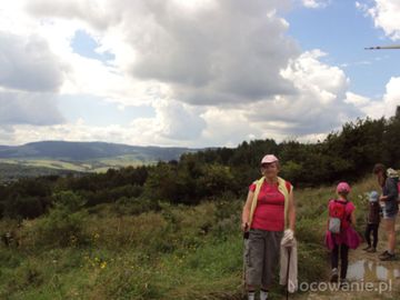 "Las Ostrowiec" po prawej, a widok jaki się otworzył na dolinę potoków Horyłka i Płonka jest rzeczywiście wspaniały, widać też fragment śmigła turbiny wiatrowej a my obok "Lasu Parszywiec" przez Łazy i Nędze - przejdziemy.