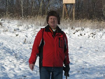 leśnym duktem, obok/przed jedną z licznych ambon myśliwskich. (Raczkowa)