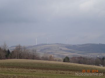 łyse pasmo "Dziady" i fragmentarycznie zalesione pasmo "Żurawinki", het na lewo "Las Dił" - no i farmę wiatrową też widać, tam jeszcze na skraju lasu jest kirku (Tokarnia)