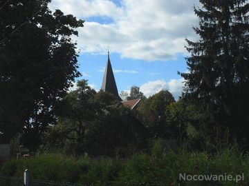 Mały i malowniczy kościółek w Hucie Kalnej widziany zza drzew. (Czarna Huta)