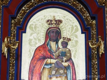 Matka Boska Szkaplerzna - obraz z 1859r. w polu głównym ołtarza w kościele, na zasuwie jest Trójca Święta.