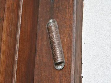 mezuza - na framudze drzwi prowadzących do Domu Żydowskiego - i tu akurat do Muzeum - Izby Pamięci Społeczności Żydowskiej w Rymanowie, mezuza zawiera pergamin (Rymanów)