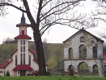 między dzwonnicą cerkiewną a nowym kościołem : jest droga / składowa małej pętli bieszczadzkiej, toteż przy okazji jakby polecam: "Na bieszczadzkich obwodnicach" - autorstwa Stanisława Orłowskiego i Przemysława Taranowskiego - to szczegółowy bedeker o Bieszczadach. Zawiera szereg informacji niezbędnych dla osób przybywających w tym rejonie.