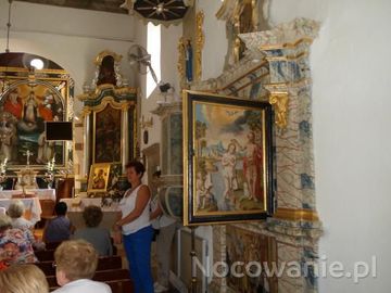 miejscowa pani przewodnik prezentuje nam ukrytą w starych murach tej świątyni chrzcielnicę - n/z po prawej obraz przedstawiający Chrzest Pański - to za nim chrzcielnica. Dalej przy ścianie jest ambona - tzw. pozorna bo dziś nie prowadzą do niej schodki, nad nią baldachim - na nim przedstawione Oko Opatrzności - bogactwo treści religijno-biblijnych.