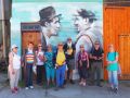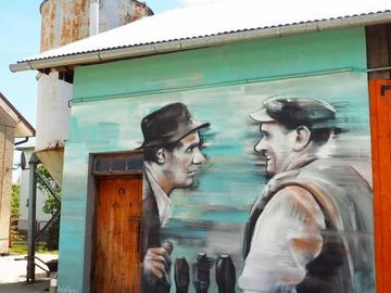mural - scena z filmu pt. "Sami swoi" - na ścianie obiektu gospodarskiego w zagrodzie sołtysa wsi, przy temacie : zapraszam do galerii m. Nowotaniec - tam też prace tego artysty.