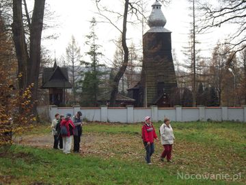 n/z na alejkach parku dworskiego a dalej za murem : niegdyś kaplica dworska, a to też najstarszy drewniany kościółek - przy pętli bieszczadzkiej, "perełka" na szlaku świątyń chrześcijańskich.
