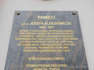 na budynku "Łazienek" : medalion i tablica upamiętniająca lekarza, ortopedę i zasłużonego dla uzdrowiska dra Aleksiewicza.