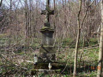 na cmentarzu wyznawców obrządku grecko-katolickiego, do czasu wysiedleń - mieszkańców tej wsi - duży płat barwinka stanowi poszycie leśne, cmentarne. Można mniemać, że pomnik nagrobny z krzyżem pochodzi z pracowni kamieniarskiej z pobliskiej wsi Przybyszów /jest galeria - zapraszam/, podobne na cmentarzu we wsi Wolica /jest galeria - zapraszam/.