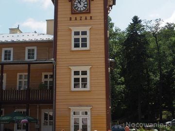 na deptaku przy : czworobocznej wieży zegarowej zwanej potocznie Bazarem - obiekt z 1878r., stanowi wizytówkę uzdrowiska, tu w ogródku n/z po lewej polecamy lod (Iwonicz Zdrój)