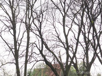 na drzewach w parku otaczającym zamek - tysiące gawronich gniazd, czarne ptaki całą okolicę napełniają głośnym krakaniem, n/z widoczny od zamku kościół pw. św. (Dębno)