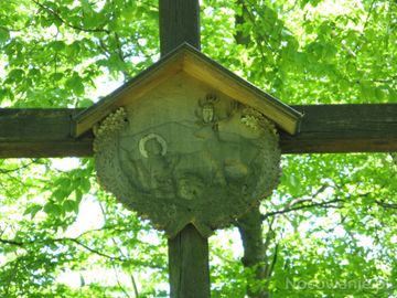 na drzeworycie scena ze św. Hubertem klęczącym przed jeleniem, święty ten jest patronem myśliwych, leśników, strzelców a także lunatyków i chorych na epilepsję, (Falejówka)