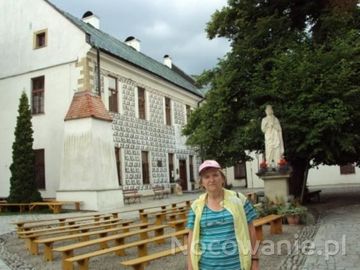 na dziedzińcu przykościelnym, przed figurą św. Kingi /św. Kunegundy/ - w zespole Klasztoru Sióstr Klarysek. Po lewej : wsparty szkarpą w narożniku Dom św. Kingi (Stary Sącz)