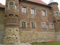 na dziedzińcu zamkowym - dalej wejścia do turmy - więzienia - tam narzędzia tortur, magazyn win - tam dzbanki, beczki, butle, kuchnia i spiżarnia z apteką zamko (Dębno)