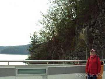 na koronie zapory wodnej, na jej początkowym fragmencie z widoczną brzegową ścianą skalną. (Solina)