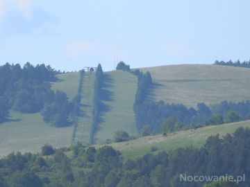 na odkrytym stoku Szerokiego Łanu: wyciąg narciarski, dalej tereny wsi Przybyszow - kiedyś sporej, ludnej, tam do wojny działał kamieniołom, kamieniarskie wyrob (Karlików)