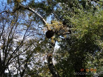 na potężnej brzozie przy stawie : pielesz - gniazdo ptaka drapieżnego, mówiono że nawet to puchacza - największego z polskich sów, sporo kosteczek ssaków i piór (Posada Jaćmierska)