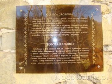 na ścianie kaplicy grobowej : tablica z informacją w językach polskim i ukraińskim.