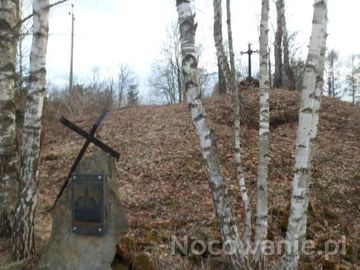 na tym wzgórzu wzniesiony był ewangelicki kościół - na wierzchowinie są czytelne resztki podmurówki, tu na płycie przedstawione zdjęcie archiwalne.