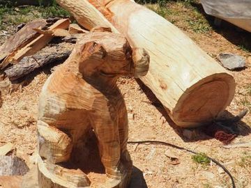 na warsztatach u rzeźbiarza - pan Piotr wskazuje na świątka - tu dzieło podczas realizacji, jest i piesek ale tam dużo, dużo więcej a drewno schnie i czeka na obróbkę - różne gatunki drewna i o tym też nam wyjaśniano - toteż przy okazji : dziękujemy !