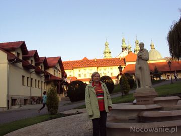 na wirydarzu - przed figurą św. Franciszka. Przed zespołem kościelnym: widoczny - sklep z dewocjonaliami, zaś po lewej: Dom Pielgrzyma i Muzeum Misyjne oraz duż (Kalwaria Zebrzydowska)