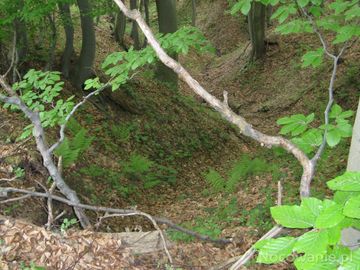 na wzgórzu był gród - zamek - pałac - dwór: przez stulecia napadany, grabiony, z dymem puszczany - na nowo wznoszony, często przebudowywany, fortyfikowany, o wieże uzupełniany i lochy jakby bardziej pojemne - silnie zniszczony podczas najazdu wojsk węgierskich Jerzego Rakoczego II - księcia siedmiogrodzkiego - w 1657r. - na zdjęciu: wały, fosy, transzeje - XVI-XVII wiek.