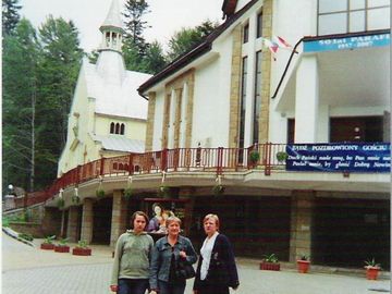 na zdjęciu: przed nowym kościołem parafialnym. W jego cieniu wznosi się stary drewniany kościół pw. św. Iwona i Matki Bożej Uzdrowienia Chorych - z 1838r. Do (Iwonicz Zdrój)
