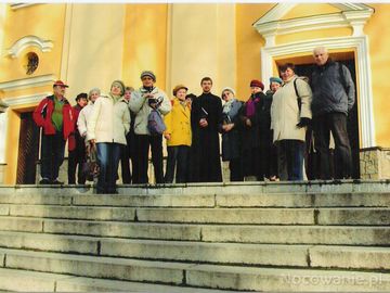 na zdjęciu: przed Sanktuarium Matki Bożej Starowiejskiej Miłosierdzia Królowej Pogórza - studenci UTW z Sanoka z księdzem jezuitą - przewodnikiem po bazylice i (Stara Wieś)