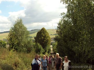 na zdjęciu: studenci - słuchacze Uniwersytetu Trzeciego Wieku z Sanoka podczas rajdu na trasie: Nowotaniec - Wola Sękowa - Pielnia na dworskim gościńcu. Na wzniesieniach farma wiatrowa.
