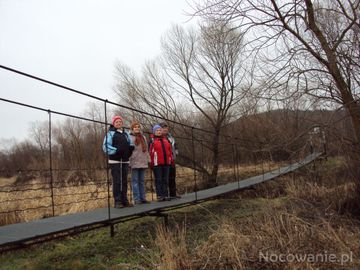 nad rzeką Sanoczek - kładka wisząca, solidnej konstrukcji, n/z po prawej pasmo Glinice - 393m npm.